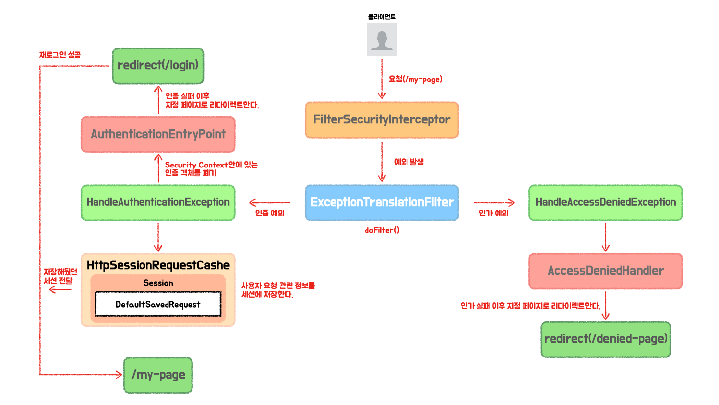 (해당 작업은 HttpSessionRequestCashe 클래스가 수행한다.) - AuthenticationEntryPoint 클래스를 사용하여 Security Context에 만들어놨었던 인증 객체를 폐기하고 사용자가 다시 인증할 수 있도록 로그인 페이지로 리다이렉트한다.